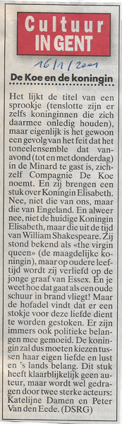 De Koe en de koningin… (Elisabeth en Essex) Dit delen: Klik om te delen op Facebook (Opent in een nieuw venster) Facebook Klik om te delen op X (Opent in een nieuw venster) X Klik om dit te e-mailen naar een vriend (Opent in een nieuw venster) E-mail Klik om af te drukken (Opent in een nieuw venster) Print Meer Klik om op LinkedIn te delen (Opent in een nieuw venster) LinkedIn Klik om op Pinterest te delen (Opent in een nieuw venster) Pinterest Vind-ik-leuk Aan het laden...
