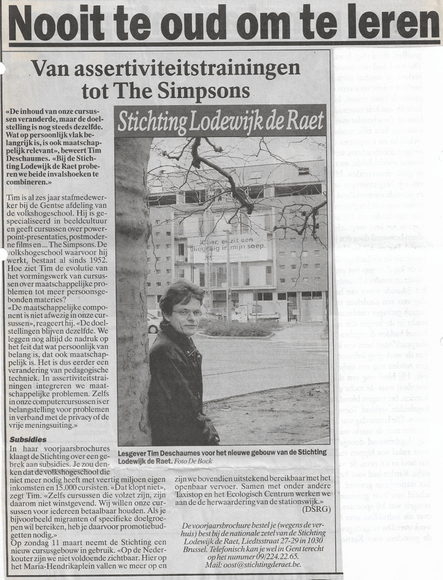 Lesgever Tim Deschaumes voor het nieuwe gebouw van de Stichting Lodewijk de Raet (foto Joost De Bock) Dit delen: Klik om te delen op Facebook (Opent in een nieuw venster) Facebook Klik om te delen op X (Opent in een nieuw venster) X Klik om dit te e-mailen naar een vriend (Opent in een nieuw venster) E-mail Klik om af te drukken (Opent in een nieuw venster) Print Meer Klik om op LinkedIn te delen (Opent in een nieuw venster) LinkedIn Klik om op Pinterest te delen (Opent in een nieuw venster) Pinterest Vind-ik-leuk Aan het laden...