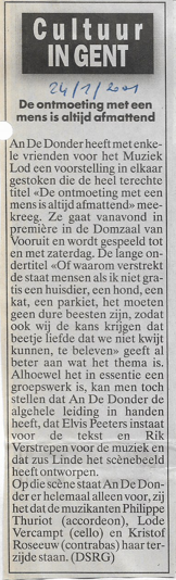 De ontmoeting met een mens is altijd afmattend volgens An De Donder (foto YouTube) Dit delen: Klik om te delen op Facebook (Opent in een nieuw venster) Facebook Klik om te delen op X (Opent in een nieuw venster) X Klik om dit te e-mailen naar een vriend (Opent in een nieuw venster) E-mail Klik om af te drukken (Opent in een nieuw venster) Print Meer Klik om op LinkedIn te delen (Opent in een nieuw venster) LinkedIn Klik om op Pinterest te delen (Opent in een nieuw venster) Pinterest Vind-ik-leuk Aan het laden...