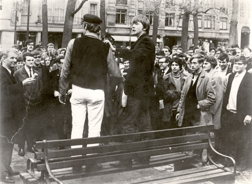 Dat Erkki wat durfde als het erop aankwam bleek tijdens de legertentoonstelling op het Sint-Pietersplein in de herfst van 1966, toen hij de enige Gentse provo bleek te zijn die het aandurfde een rookbom te gooien naar een tentoongestelde straaljager. Ook daarmee haalde hij het nieuws, en helaas ook de gevangenis omdat een omstaander – dat wil zeggen een geheimagent in trainingspak en met koersfiets – hem in de loop van de avond alsnog op straat herkende. Hij werd zo schandalig lang in voorarrest gehouden dat de studenten van de universiteit uit protest een dag in staking gingen om hem vrij te krijgen. Ik herinner mij ons zwaar op de proef gestelde stakingspiket aan de faculteit van de apothekers nog heel goed, maar dankzij het gloedvolle pleidooi van mijn advocaat Piet Van Eeckhaut kwam ik ervan af met een boete van 500 frank.