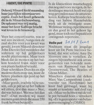 Een uitgelaten koor Kalliope in de Minardschouwburg met vooraan v.l.n.r. deken Marc Van Campenhout, dirigente Sabine Haenebalcke en soliste Amy De Sloovere (foto Johan Martens)