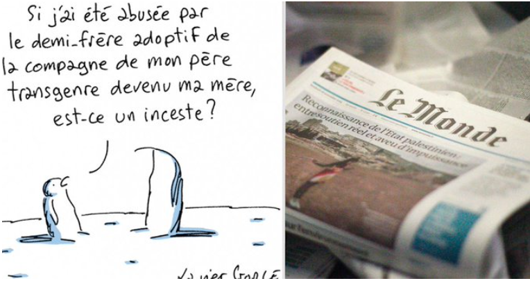 De vraag van de kleine vetgans is nochtans duidelijk: “Als ik verkracht werd door mijn geadopteerde halfbroer van de vriendin van mijn transgendervader die nu mijn moeder is geworden, is er dan sprake van incest ?” Vijftig jaar geleden zou heel Frankrijk sardonisch gelachen hebben, er viel wel wat grovers te bedenken in Hara-Kiri, L’Echo des Savanes of Fluïde Glacial (de kastijding van Pompidou destijds, of de wellustige spot met moslimfanaten, of de waanzinnige ridikulisering van de goden in Gotlibs God’s Club hadden ten minste nog ongeremd de libertijnse geest van de Verlichting).