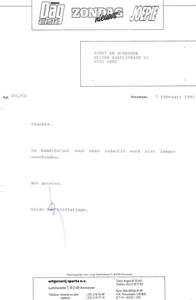 (*) Op 6 maart 1990 had Van Liefferinge mij ook al afgewezen als kandidaat corrector voor de bladen van de Sparta-groep heb ik later vastgesteld.