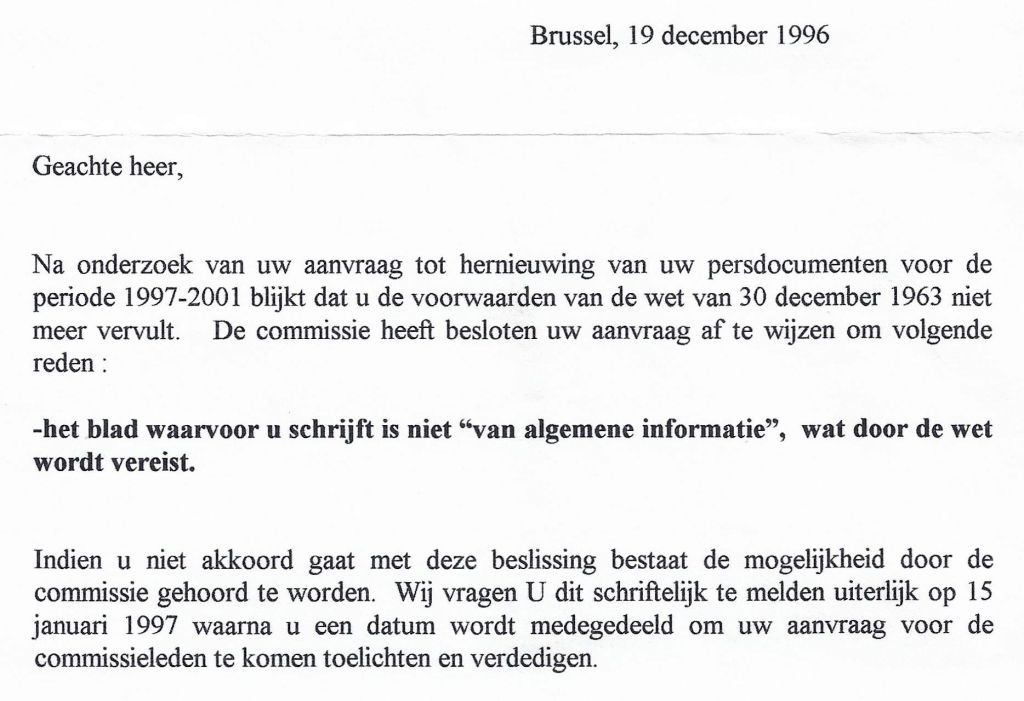 De Rode Vaan was op dat moment al een tijdje ter ziele gegaan en in mijn hoofdberoep werkte ik op dat moment voor de Centrale voor Socialistisch Cultuurbeleid. Eén van mijn taken daar was het verzorgen van het blad “Hoogste tijd”, maar dat was slechts een kwartaalblad, dus dat kwam niet in aanmerking voor de journalistenbond. Ik werkte toen ook volop als losse medewerker voor Het Laatste Nieuws, maar daar verdiende ik dan weer niet het zout op mijn patatten, zodat ook dat niet in aanmerking kwam. En zo verloor ik dus mijn erkenning als beroepsjournalist, wat ik als een zeer harde slag heb ervaren.