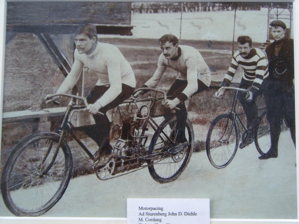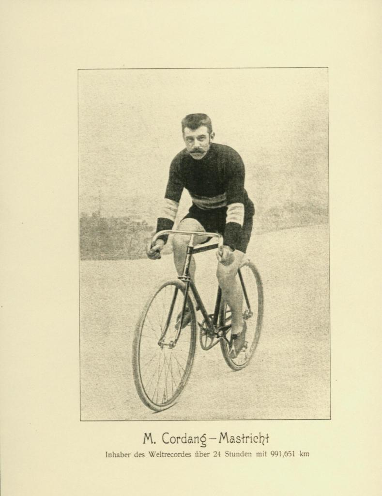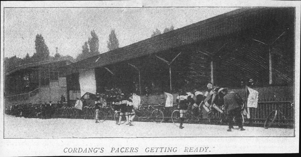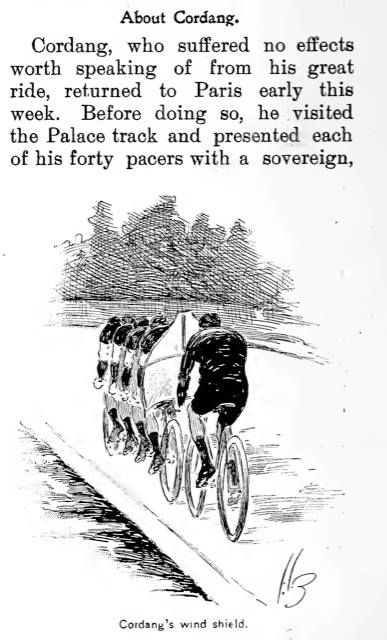 De grote koersen in die dagen worden gereden met levende of mechanische gangmaking. We volgen nog even het verslag van Bordeaux-Parijs 1897 uit de Dunlop folder: “…Cordang was by den laatsten wedstryd Bordeaux-Parys zyn mededingers by de eerste 500 km ver vooruit en hy zou waarschynlyk den wedstryd gewonnen hebben, ware het niet dat de Heer Charron die hem met een motorrytuig in een fellen tegenwind tot pacemaker diende, hem in den steek moest laten doordat de Heer Charron al zyn brandstof, petroleum, verbruikt had. Cordang’s meest gevreesde concurrent Rivierre, echter had een groot aantal motorytuigen tot zyn dispositie, zoodat deze goed tegen den langs de boorden van de Loire huilenden wind beschut met eene snelheid van 40 km per uur voorbystoof” Er werd trouwens verteld dat Rivierre van links naar rechts zigzagde om Cordang te beletten aan te pikken. Alleen vechtend tegen een apocalyptische natuur werd hij slechts tweede.
