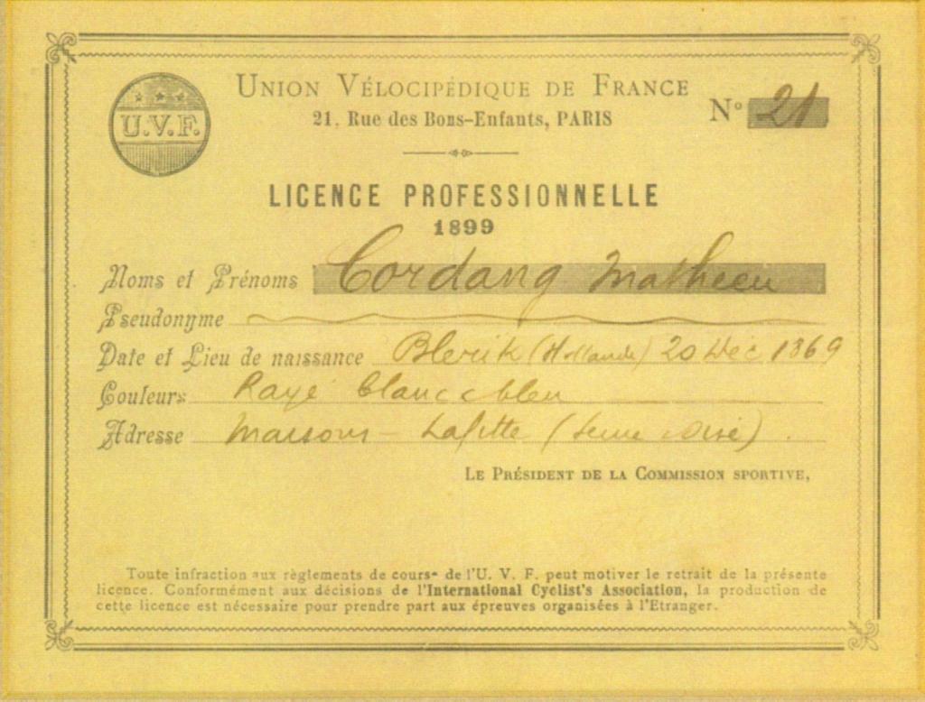 Die amateurwedstrijden waren natuurlijk wel aardig. maar wat moet je met al die medailles. om maar te zwijgen van ereprijzen als een Noorsche drinkhoorn in zilver, pendule in rood pluche of een in zilver gemonteerde hertenpoot als scheltrekker. Allemaal relicten uit de tijd dat het rennerscorps nog voornamelijk bevolkt werd door dubbele namen als Gualthérie van Weezel, Korthals Altes of Van Pallandt Riebout. Nee, als prof was er goudgeld te verdienen, zeker in het buitenland. Parijs, Berlijn en Londen lokten. Mathieu moest zijn licentie in Parijs afhalen bij de Franse Union Vélocipédique. Voor de Nederlandse bond, de ANWB, was de beroepssport nog een verdorven bezigheid. In meerdere opzichten waren ze overigens recht in de leer; maar daarover later.