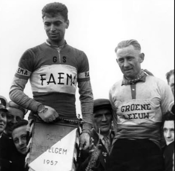 65 jaar geleden won Rik Van Looy voor de tweede keer op een rij Gent-Wevelgem. Deze keer was André Noyelle tweede (niet op de foto) en Lucien Mathys derde.