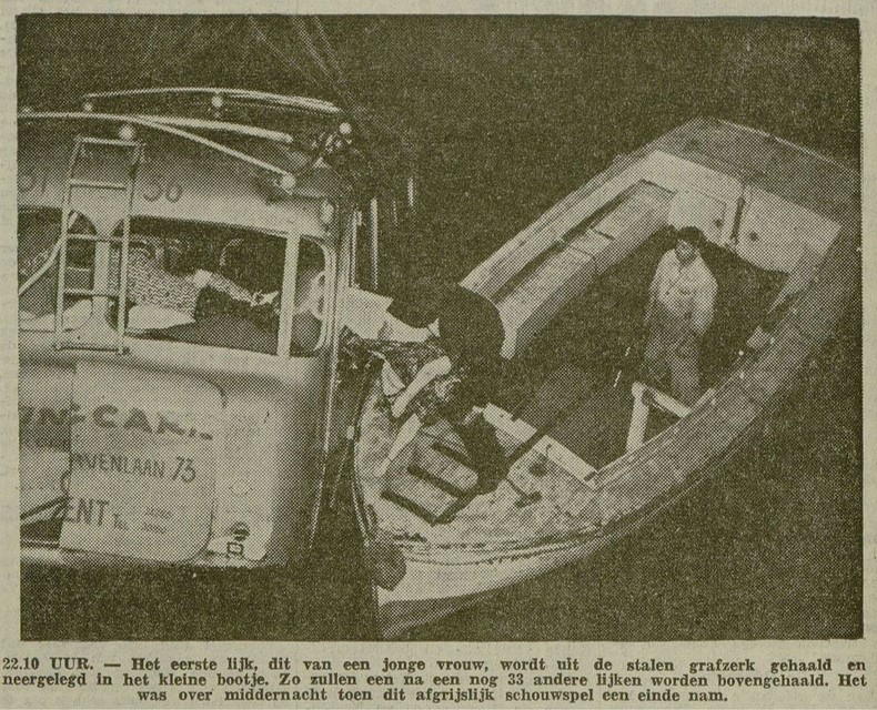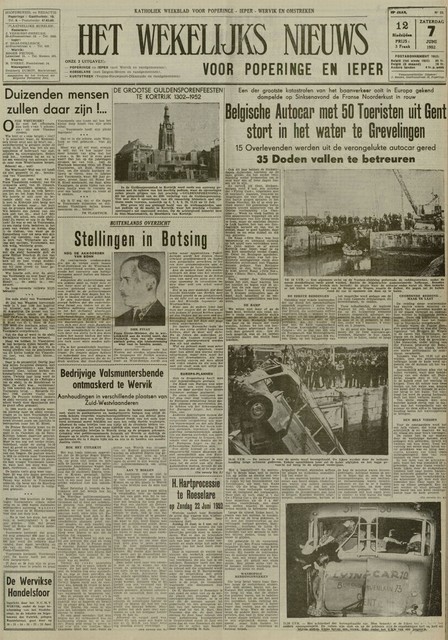 Wat een ontspannen daguitstap door Frans-Vlaanderen moest worden, eindigde op 1 juni 1952 in een van de grootste verkeersdrama’s uit onze geschiedenis. Een bus met 50 Gentse toeristen, allemaal supporters van het toenmalige ‘La Gantoise’, nu KAA Gent, raakt in het Noord-Franse Grevelingen van de weg en kantelt in het water. De balans was zwaar: 35 mensen sterven een verdrinkingsdood na een vreselijke doodstrijd, amper 15 passagiers kunnen gered worden. (Foto uit het archief van Het Wekelijks Nieuws, Stadsarchief Poperinge)