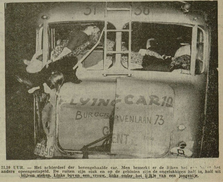 Wat een ontspannen daguitstap door Frans-Vlaanderen moest worden, eindigde op 1 juni 1952 in een van de grootste verkeersdrama’s uit onze geschiedenis. Een bus met 50 Gentse toeristen, allemaal supporters van het toenmalige ‘La Gantoise’, nu KAA Gent, raakt in het Noord-Franse Grevelingen van de weg en kantelt in het water. De balans was zwaar: 35 mensen sterven een verdrinkingsdood na een vreselijke doodstrijd, amper 15 passagiers kunnen gered worden. (Foto uit het archief van Het Wekelijks Nieuws, Stadsarchief Poperinge)