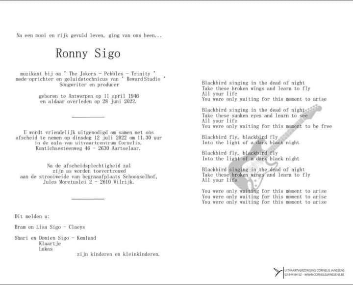 De Antwerpse gitarist Ronny Sigo, vooral bekend van The Jokers en de nieuwe Pebbles, is overleden, zo weet Luc Soens van de Gentse groep Jawadde op Facebook te melden…