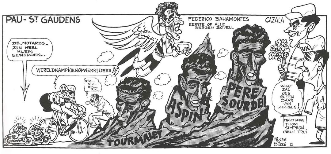 Zestig jaar geleden nam Tom Simpson als eerste (?) Brit de gele trui na de twaalfde rit van Pau naar Saint-Gaudens. Uiteraard een Pyreneeënrit, gedomineerd door de Spanjaard Federico Bahamontes maar gewonnen door de Fransman Robert Cazala. In “Het Volkske” gaf Marc Sleen hier op zijn onnavolgbare manier een weerslag van. Voor wie de eerste opmerking niet begrijpt: wereldkampioen en aanvaller Rik Van Looy was kort daarvoor uitgevallen na te zijn aangereden door een motard…