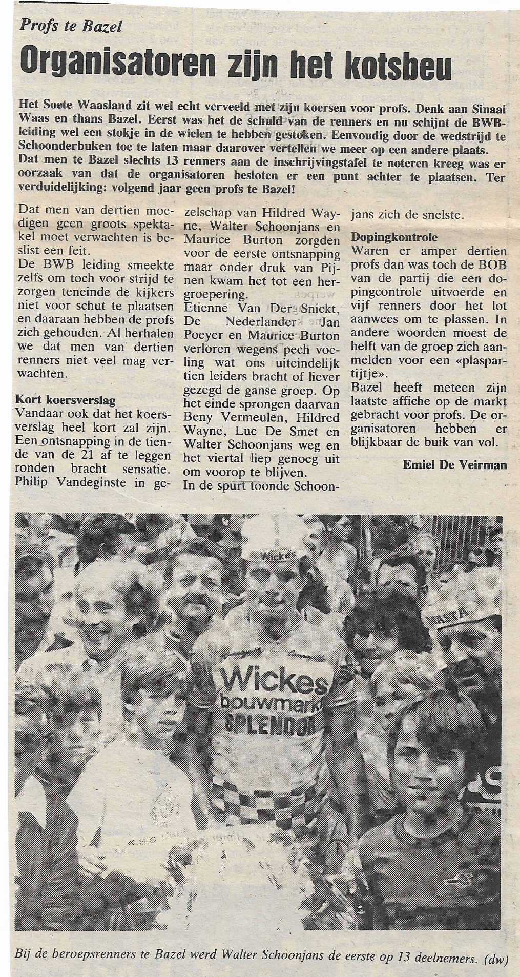 Veertig jaar geleden won Walter Schoonjans de beroepsrennerswedstrijd in Bazel. Hij bleef… twaalf concurrenten de baas. Voor de organisatoren was dan ook de maat vol…