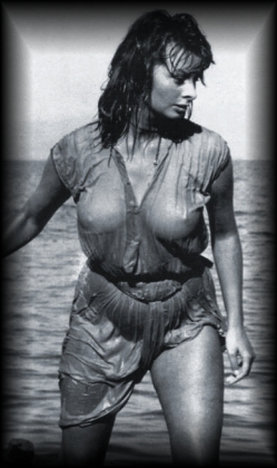 Op het gebied van seks is Italië van oudsher gespecialiseerd in naaktheid “sec”, in blootheid die niet “functioneel” is in een of andere erotische context. De Italiaanse censuur stond hier nogal tolerant tegenover. Vele sterren en nog veel meer sterretjes die later min of meer beroemd zijn geworden, zijn dan ook begonnen als bloot haremmeisje of slavinnetje in ongecompliceerde, quasi-historische avonturenfilms. Zo begon Sophia Loren haar carrière in “Il segno di Zorro” (1950). Daarna werd ze als zwarte opgevoerd in een merkwaardige verfilming van de Verdi-opera “Aida” door Clemente Francassi. Aangezien haar stem vervangen werd door die van Renata Tebaldi, had de regisseur hier zelfs meer dan ooit de kans om eens een echte zwarte in de hoofdrol van deze opera te casten. Maar neen, het werd dus het seksidool van dat moment, Sophia Loren, die met lichtbruine schoensmeer werd ingestreken. Lichtbruin, jawel, want deze Ethiopiërs moesten niet echt zwart zijn, aangezien de Egyptenaren blank als botermelk waren! In 1955 draaide ze o.m. “Il segno di Venere” en “Pane, amore e…” (foto).