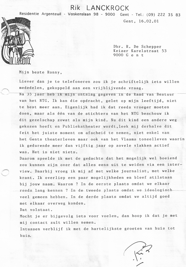 Rik was voor mij overigens de aanleiding (en ik druk op het woord ‘aanleiding’, de oorzaken lagen uiteraard dieper en gingen al enkele jaren terug) om mijn medewerking aan Het Laatste Nieuws te staken. De overgang van het NTG naar het Publiekstheater was voor hem immers de aanleiding (of de oorzaak? hier weet ik het natuurlijk niet zo goed) om zich uit het Gentse theaterleven terug te trekken. Hij had me voorgesteld hierover toelichting te geven in HLN. Ik heb dit interview goed voorbereid en stelde toen vast dat dit onmogelijk kon voor HLN. Mijn voorbereiding alleen al was veel te uitgebreid voor de lengte die voor de grootste (!) stukken wordt gereserveerd en dan moest Rik nog aan het woord komen. En Rik kennende, wist ik dat die geen genoegen zou nemen met een ‘beknopte samenvatting’. Neem daarbij nog dat HLN meestal een specifieke invalshoek kiest (‘sensatiezucht’ zou confrater Frank Pauwels van De Gentenaar het noemen), zodat ik besefte dat ik voor een onmogelijke opdracht stond. Ofwel zou ik het vertrouwen van Rik moeten beschamen, ofwel zou ik alweer een artikel schrijven dat in de prullenmand zou verdwijnen of onherkenbaar verminkt zou worden (en waarvoor ik op de koop toe zou mogen opdraaien, want tenslotte staat mijn naam er toch onder). Vandaar dus…