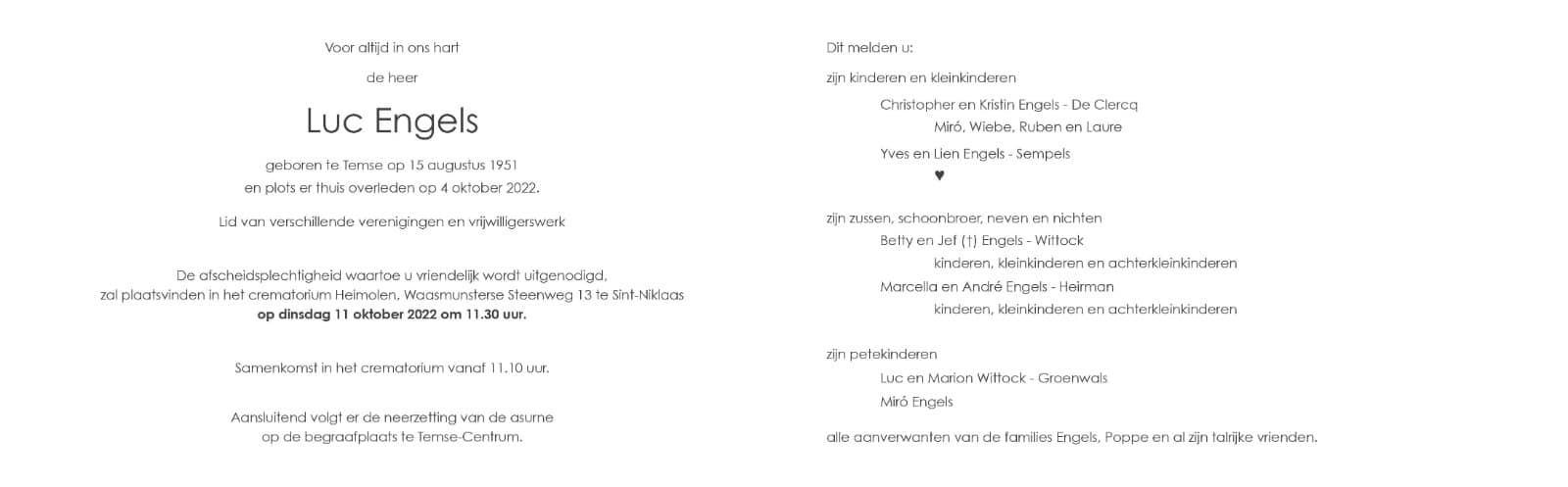 Erik Westerlinck meldt me zopas dat op 4 oktober onze gemeenschappelijke jeugdvriend Luc Engels is overleden.