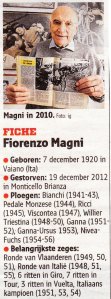 Over de doden niets dan goeds. Meermaals heb ik reeds gesteld dat ik het op het eerste gezicht met die stelling eens ben. Maar de waarheid heeft uiteraard ook haar rechten en dan heb ik het meer bepaald over Fiorenzo Magni, die vandaag precies tien jaar geleden is gestorven. En uiteraard heb ik het dan niet over zijn prestaties als renner, want zijn palmares spreekt voor zichzelf, zoals men hieronder kan lezen op een knipsel uit Het Nieuwsblad. Maar er is nog een ander, “extra-sportief” element en aangezien niemand, maar werkelijk niemand, het erover heeft, wil ik het dan toch maar even hebben op het merkwaardige ontbreken van het jaartal 1946 bij het overzicht van zijn ploegen…