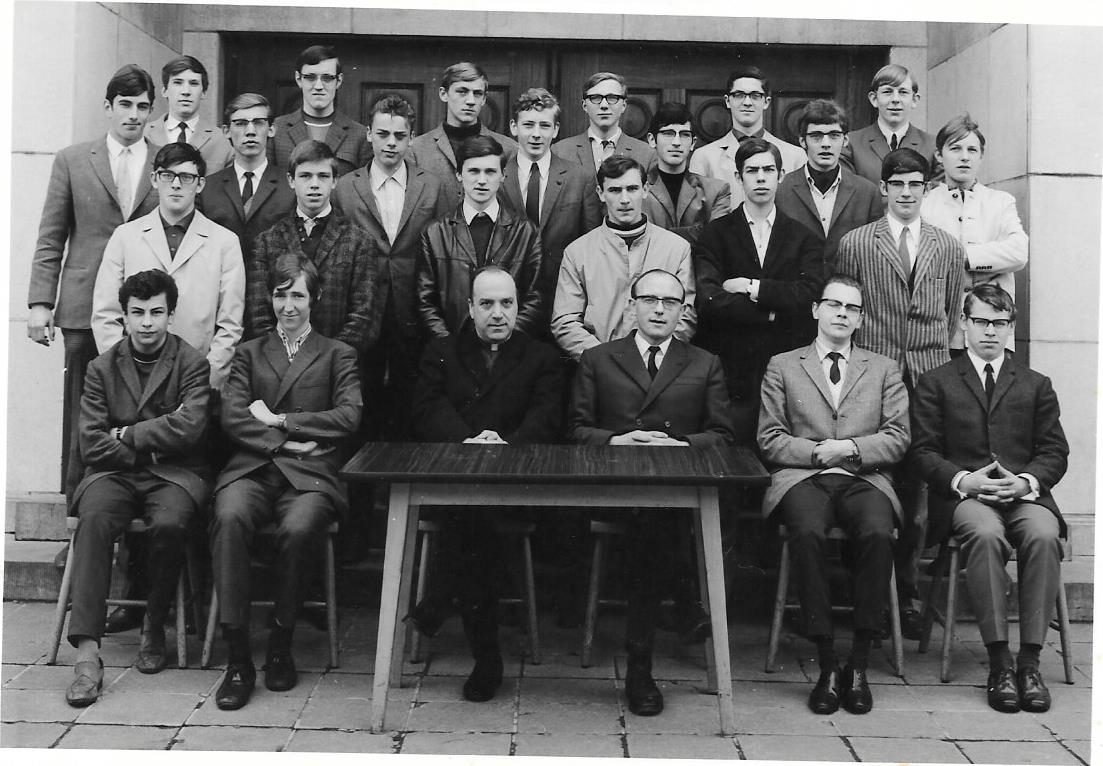 Wie ik daar wél heb leren kennen, was Miels broer Marc (tweede van links op de tweede rij). In de studie werden wij verplicht naast iemand uit een andere richting te zitten (men dacht dat er dan minder gebabbeld zou worden) en dus kwam ik als Latinist naast iemand uit de moderne te zitten, een zekere De Wilde uit Beveren (hij heette óók Marc, meen ik me te herinneren, en hij zou ook op deze foto moeten staan, maar ik herken hem niet meer). En die was dan weer de beste vriend van Marc Dullaert, zodat deze schuin vóór mij kwam te zitten. (’t Is wel een beetje eigenaardig dat ik me dat zo goed herinner, want wie de klasgenoot was die vlak vóór mij zat, dat weet ik niet meer.)
