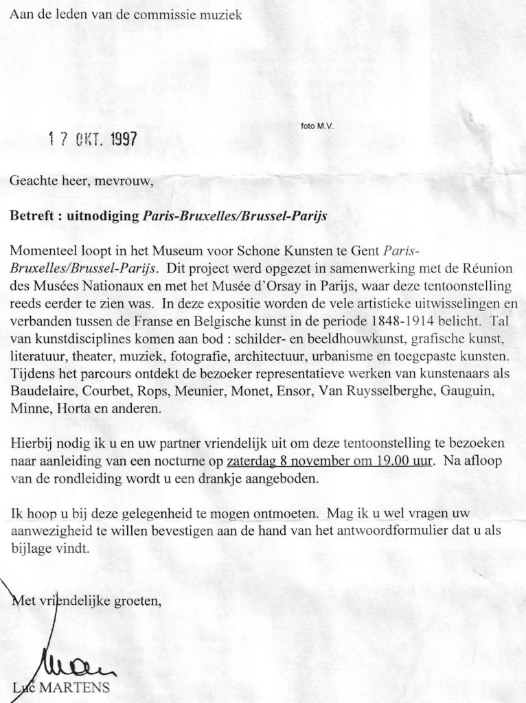 25 jaar geleden bracht ik samen met de andere leden van de commissie muziek een bezoek aan de tentoonstelling Paris-Bruxelles/Brussel-Parijs in het Museum voor Schone Kunsten op uitnodiging van minister Martens. Dit delen: Klik om te delen op Facebook (Opent in een nieuw venster) Facebook Klik om te delen op X (Opent in een nieuw venster) X Klik om dit te e-mailen naar een vriend (Opent in een nieuw venster) E-mail Klik om af te drukken (Opent in een nieuw venster) Print Meer Klik om op LinkedIn te delen (Opent in een nieuw venster) LinkedIn Klik om op Pinterest te delen (Opent in een nieuw venster) Pinterest Vind-ik-leuk Aan het laden...