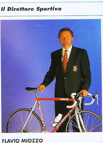 Directeur sportif, sportbestuurder, ploegleider. Van wie of wat dan wel. Maak dat de kat maar wijs mevrouwtje. Het is 29 juni 1993, drie dagen voor de proloog van de Grande Boucle. Zo iemand moet dan toch zeker regelen, ritselen, telefoneren, faxen. Hotels reserveren, teambesprekingen houden, de VIP-kaartjes uitdelen en god weet wat al niet meer. In ieder geval geen petjes en sokken verkopen in een dorpswinkeltje. Nee, dat gaat er bij mij niet in. Vanonder de toonbank tovert de man een super glossy boekwerk tevoorschijn: Team Professionistico ZG Mobili Bottecchia Selle Italia, Stagione 1993. Samen bladeren we door de pijnlijk fraaie brochure. Jawel hoor daar staat ie. Al meteen voorin het boekje prijkt de foto van il Direttore Sportivo. Na il Presidente, Davide Gregolon, het zoontje van de baas van de ZG meubelfabrieken, en naast il Team Manager, Gianni Savio, een op het oog archetype van de “latin lover”. Ontkennen is niet meer mogelijk. Hij is het echt. Flavio Miozzo: oud-beroepsrenner, winkelier en ploegleider. Voormalig knecht van Bitossi, De Vlaeminck, Van Impe en Saronni. We bladeren verder. Tussen de ZG Mobili ameublementen, kanteldeuren, koffers en sieraden wordt de complete ploeg voorgesteld. Van elke renner een toegesneden C.V. compleet met sterrenbeeld, gewicht, lengte, bloeddruk en pols. Voor onze begrippen denkelijk wat veel van het goede.