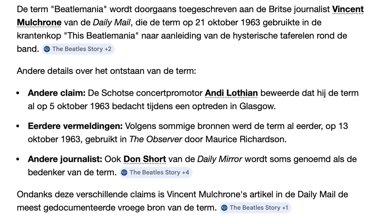 (*) Over het algemeen wordt aangenomen dat The Daily Mirror de term “Beatlemania” lanceerde voor het gedrag van de fans van The Fab Four op 2 november 1963, maar zoekend naar de gepaste illustratie heb ik ontdekt dat The Daily Mail het woord al op 21 oktober had gebruikt!