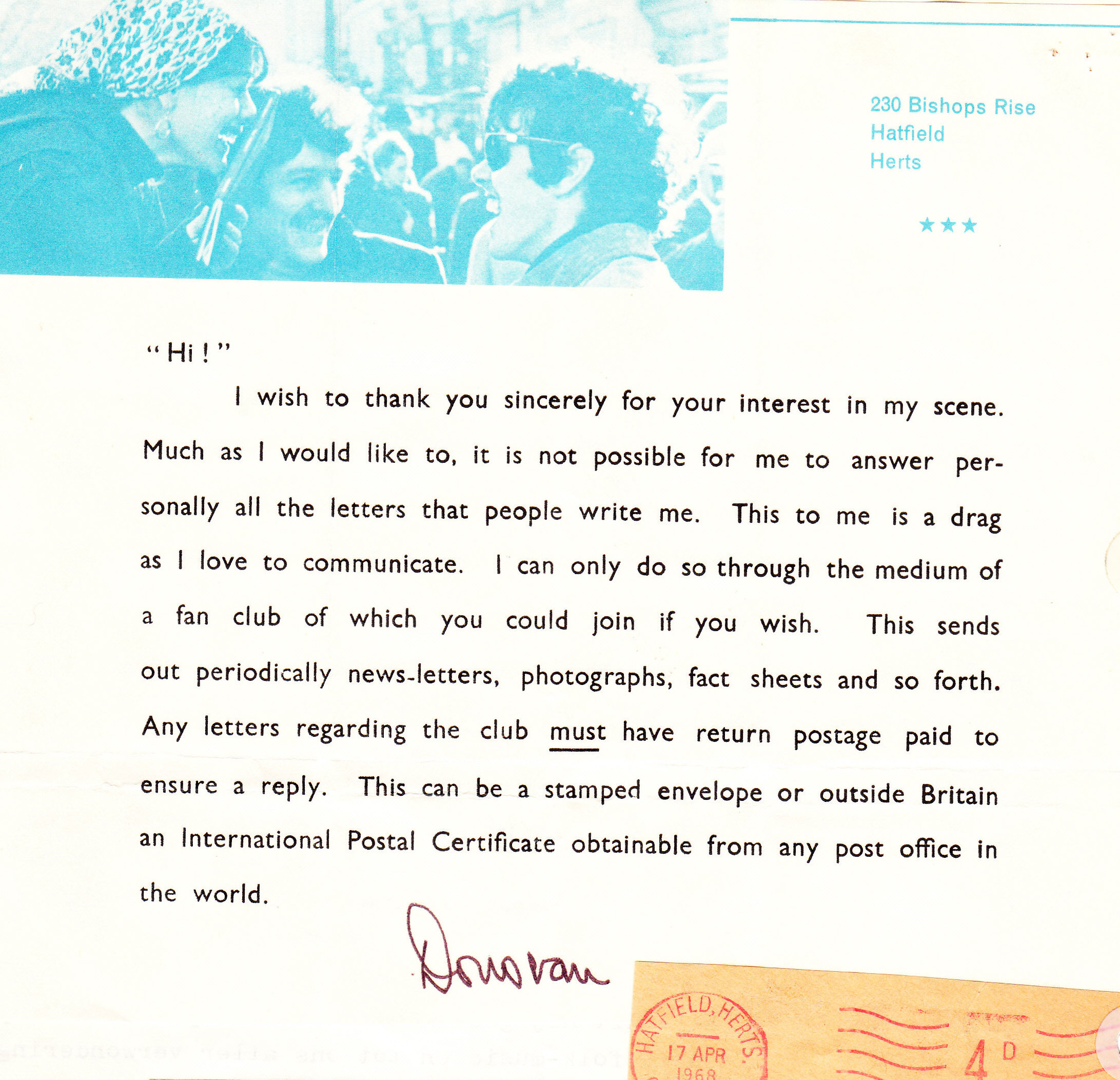 Enige tijd later zou ik een brief schrijven naar mijn idool en… ik kreeg zowaar antwoord. Het was weliswaar een voorgedrukte brief (gefrankeerd in Hatfield op 17 april 1968), maar ik heb hem mijn hele leven lang (d.w.z. tot nu toe, want nu gaat hij de papiermand in) bewaard als een kostbaar kleinood.