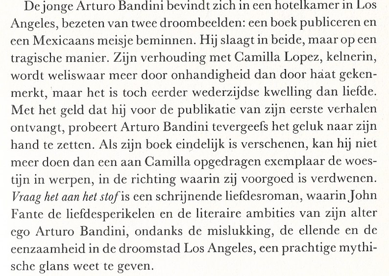 Dat “woord vooraf” van “Ask the dust” was nog een grotere spoiler dan ik had verwacht: zelfs de allerlaatste zin wordt erin prijsgegeven! Waarvoor ik echter geen verklaring heb gevonden, dat is voor de titel. Enfin, ik kan er wel zélf een interpretatie aan geven, maar in de tekst heb ik niks teruggevonden dat er min of meer letterlijk naar verwijst.