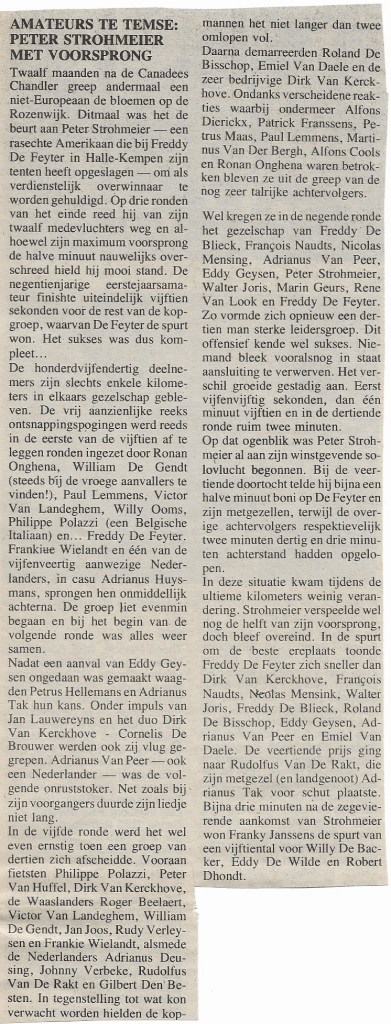 Ik ben nog altijd vruchteloos op zoek naar meer informatie over zijn vader (?) die wellicht de eerste Amerikaan was die in onze contreien kwam fietsen, maar Peter Strohmeier zelf won 45 jaar geleden een amateurkoers in Temse.