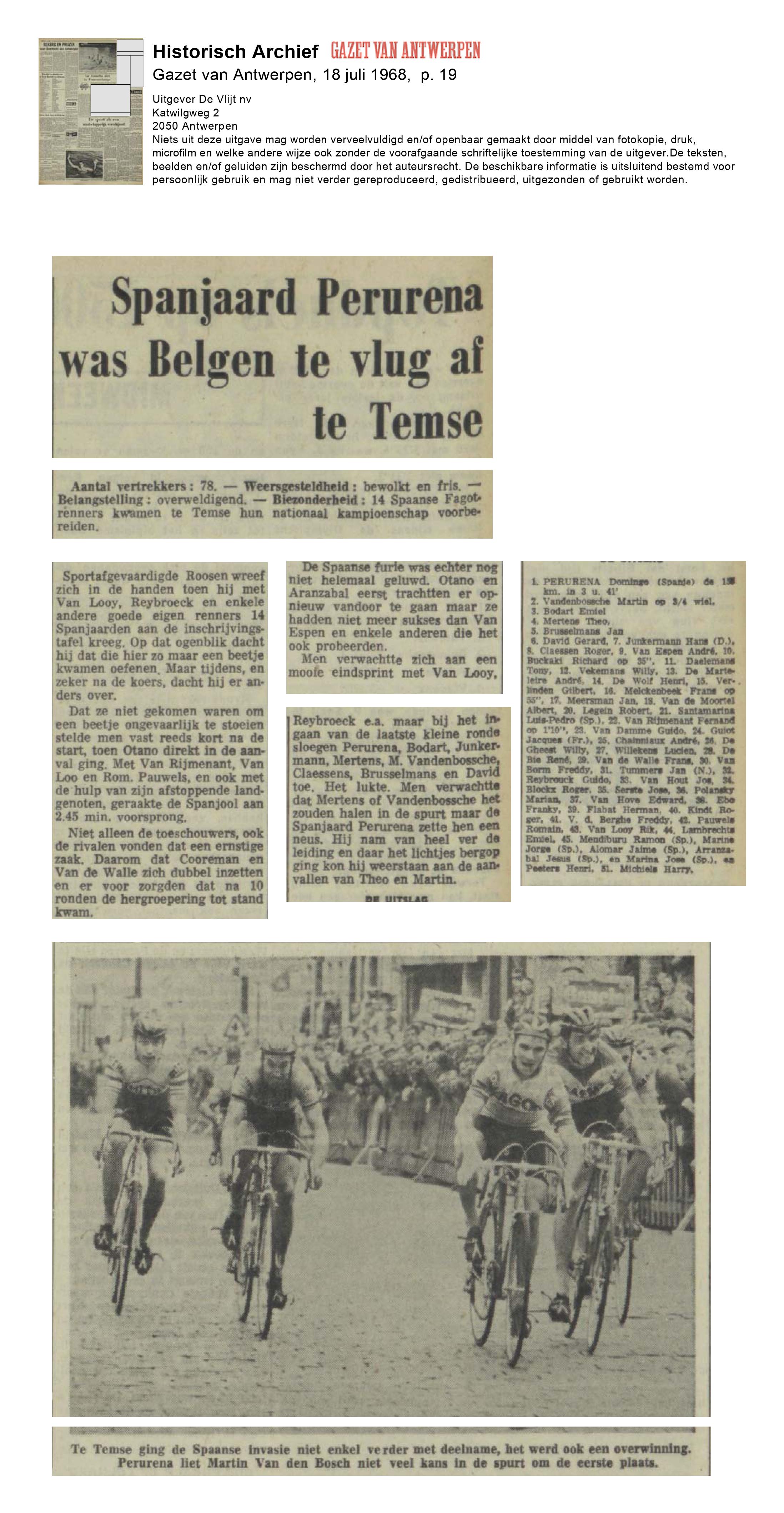 Erik Westerlinck schrijft erover in de 62ste aflevering van het Blommenkindersdagboek waarbij hij vermeldt dat Richard Bukacki 10de werd, Janneke Meersman 17de en Rik Van Looy 42ste. Ikzelf voeg daar nog aan toe: “Ik herinner me dit nog zeer goed. Degene van de organiserende Descheppersvrienden die verantwoordelijk was voor de inschrijvingen, kon helemaal niet overweg met de Spaanse paspoorten van de voltallige Fagor-ploeg die zich aan de start aanbood en schreef de tweede familienaam van de renner op i.p.v. de eerste. Zo hebben we pas ’s anderendaags in de pers vernomen dat Perurena had gewonnen en dat b.v. ook de jonge Luis Ocana aan de start had gestaan.”