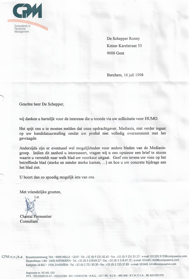 Op 29 juli 1998 schreef ik een brief aan Chantal Permentier van CPM (Consultants in Personnel Management), dat optreedt in naam van Mediaxis, als antwoord hierop: