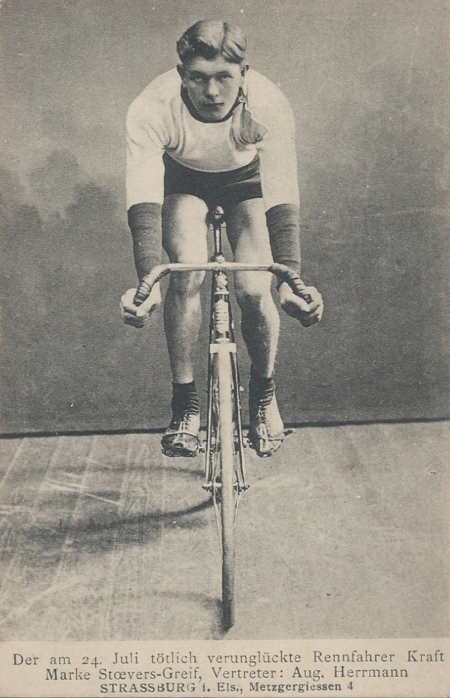 Le 24 juillet 1913, le stayer August KRAFT (°23.12.1886 à Uttenheim) décède à l’hôpital des suites d’une chute survenue lors de la Roue d’or, une épreuve de demi-fond disputée la veille sur le vélodrome de Strasbourg (appartenant alors toujours à l’Empire allemand). Modeste professionnel depuis trois ans, l’Alsacien n’avait jusque-là guère réussi à se mettre en évidence.