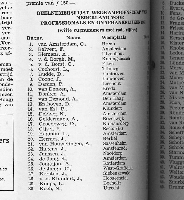 Maar wee je gebeente als de meter, die scherprechter, iets te hoog uitsloeg. Afgekeurd vanwege te hoge bloeddruk! Een verdict dat een toekomstig glorieuze carrière om zeep hielp. Zonder keuringsbewijs kon je het wel schudden. De Bond was onverbiddelijk: geen licentie. Nou, dat zullen we dan nog weleens zien sprak Dick Budde, clubgenoot van R&TC Wilhelmina uit Eindhoven. Er was immers een ontsnappingsluik. De KNWU had namelijk in al haar wijsheid uitgevaardigd dat beroepsrenners en onafhankelijken niet gekeurd hoefden te worden. Misschien gingen ze ervan uit dat die allemaal een goeie persoonlijke dokter hadden. In die dagen van het kaliber Thei Jessen of John Rolink. Aha, een maas in de wet. Dicky kreeg, zonder poespas, per omgaande van de bond een proflicentie aangereikt. Het kostte wel iets meer, maar dan had je ook wat. En zo kon het gebeuren dat hij met rugnummer 7 op de eerste rij stond in het NK 1962, tussen allemaal doorgewinterde profs. Of Dick, die bij de amateurs nog geen deuk in een pakje boter had gereden, het na de eerste bocht nog lang heeft volgehouden vermeldt de historie niet. Later ging Dicky in de antieke klokken handel. Tic-Tac Pontiac of zoiets, zullen we maar zeggen.