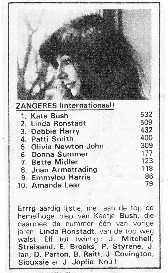 De Engelse zangeres Kate Bush wordt ook alweer 65 jaar oud. Alhoewel ik in 1978 oorspronkelijk overweldigd was door haar versie van Emily Brontë’s (*) “Wuthering heigths” in iets meer dan drie minuten (en ik was blijkbaar niet de enige, afgaande op Humo’s pop poll van dat jaar), dan vond ik al snel dat het eerder muziek om naar te “kijken” was (**). En dat zal op 65 jaar wel steeds moeilijker worden, vrees ik…