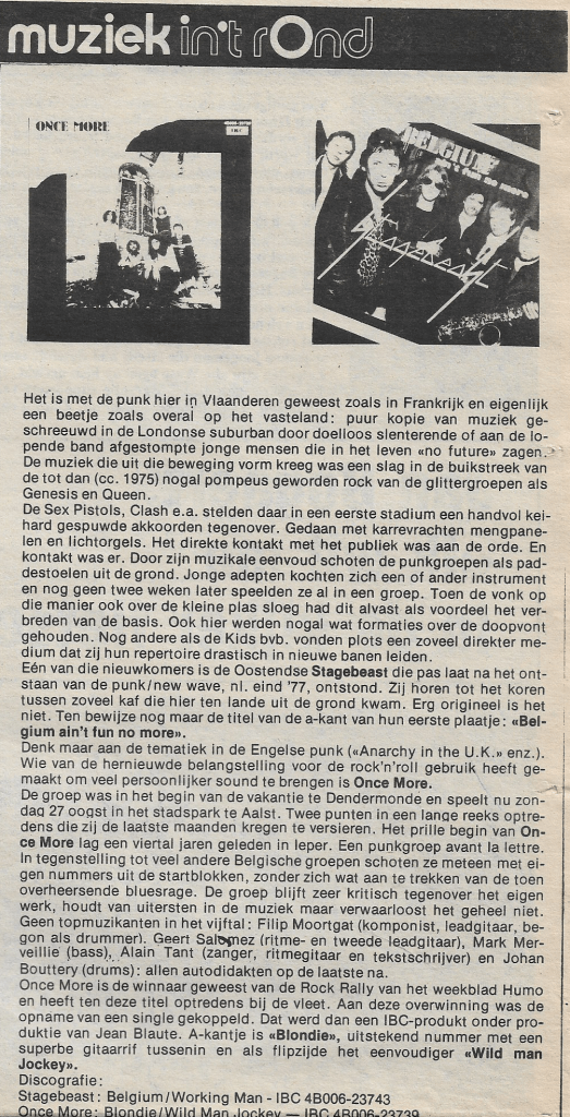 45 jaar geleden was de rubriek “Muziek in’t rond” in De Voorpost gewijd aan punk in Vlaanderen. Alhoewel het genre wordt gedefinieerd als “muziek geschreeuwd in de Londonse suburban door doelloos slenterende of aan de lopende band afgestompte jonge mensen die in het leven ‘no future’ zagen” is de tekst niet van mij. De ondertekening is weggevallen (wat wel eens meer gebeurde in DVP) maar ik ben er quasi zeker van dat hij van mijn voorganger René De Witte is.