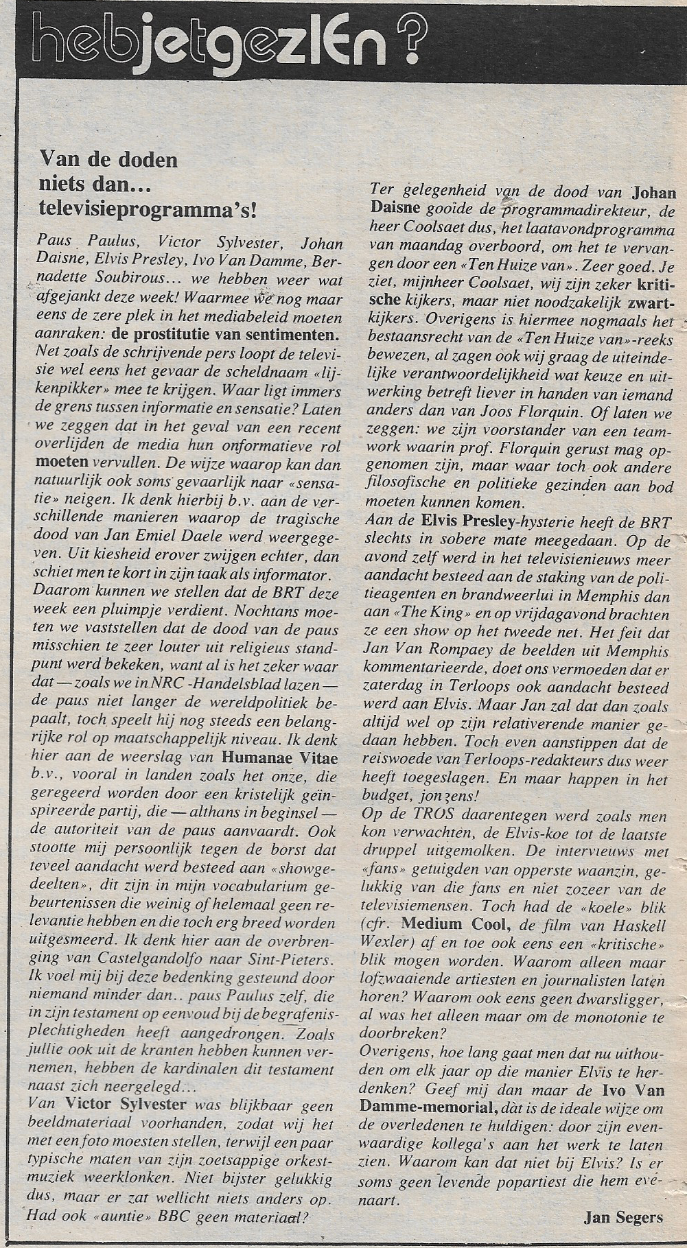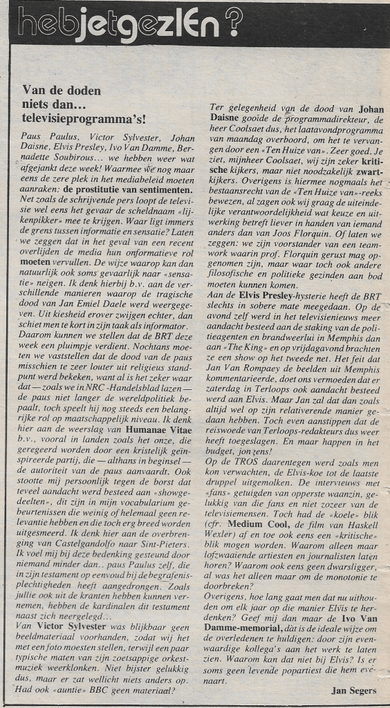 45 jaar geleden maakte ik me in de televisierubriek van De Voorpost druk over de overdreven (?) aandacht die werd besteed aan onze dierbare overledenen…