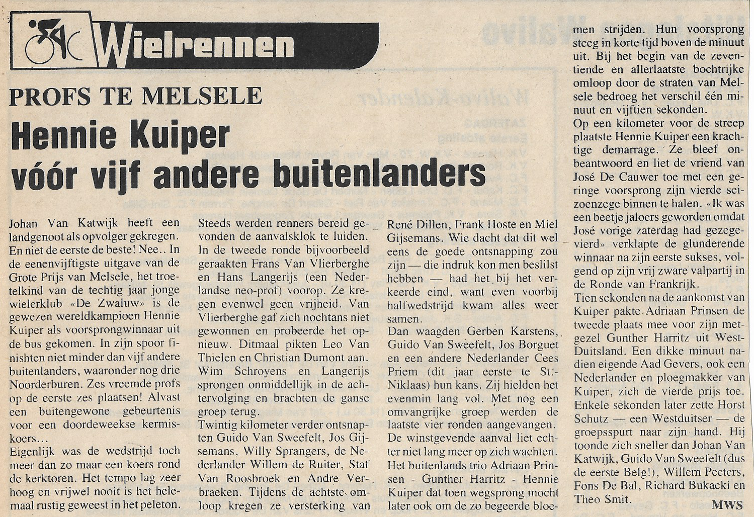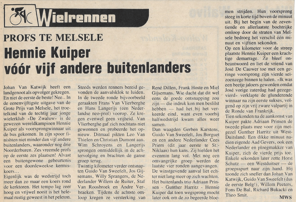 45 jaar geleden won Hennie Kuiper de kermiskoers in Melsele vóór vijf andere buitenlanders… Dit delen: Share op Facebook (Opent in een nieuw venster) Facebook Delen op X (Opent in een nieuw venster) X E-mail een link naar een vriend (Opent in een nieuw venster) E-mail Afdrukken (Opent in een nieuw venster) Print Meer Delen op LinkedIn (Opent in een nieuw venster) LinkedIn Delen op Pinterest (Opent in een nieuw venster) Pinterest Vind-ik-leuk Aan het laden...