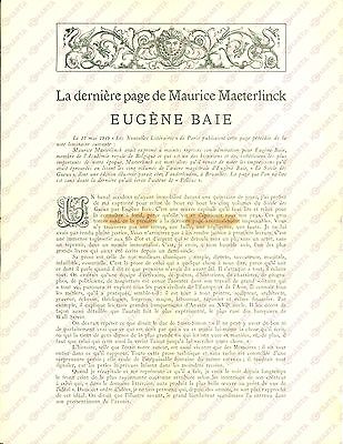 Eugène Baie werd geboren op 3 augustus 1874 in Anderlecht als zoon van een leertouwer. Bij de dood van zijn vrouw gaat zijn vader in 1895 een tweede huwelijk aan en komt de familie in Mechelen wonen. Aangezien Eugène toen dus al 21 was, kan men hem eigenlijk nauwelijks nog een “Vlaming” noemen, maar kom. Eugène is overigens nog “thuis” omdat hij voortdurend studeert. Zowel in Genève, Parijs als Oxford behaalt hij diploma’s in de Letteren en Wijsbegeerte, de Rechten, Geschiedenis en Kunstgeschiedenis. Rond de eeuwwisseling maakt hij kennis met Emile Verhaeren die hem aanzet tot schrijven. In 1902 verschijnt “L’Epopée Flamande”, dat reeds de kiem bevat die hij in “Le siècle des Gueux” zou uitwerken. In die tijd pleit hij ook voor de oprichting van een soort van Benelux om militair en economisch weerstand te kunnen bieden aan de twee reuzen die ons omringen en bovendien met elkaar overhoop lagen: Frankrijk en Duitsland. Hij maakt trouwens carrière in de internationale diplomatie. Toch publiceert hij ondertussen nog essais als “Sub Rosa et Sub Umbra” (1912) en “Le jeu des ombres sur la voie sacrée” (1922) in afwachting dat hij in 1924 aan zijn levenswerk over de Geuzen begint. In 1939 offert hij er zelfs zijn diplomatieke carrière aan op. Tijdens WO II trekt hij naar Nice. Hij wordt daar bevriend met Maeterlinck die zijn kandidatuur voor de Nobelprijs voordraagt, echter zonder resultaat. Hij stierf op 10 september 1963 en is begraven in Anderlecht. Hij laat een vijfjaarlijkse prijs van 100.000fr na voor het beste buitenlandse boek over de Vlaamse kunst, geschreven in de moedertaal van de auteur.