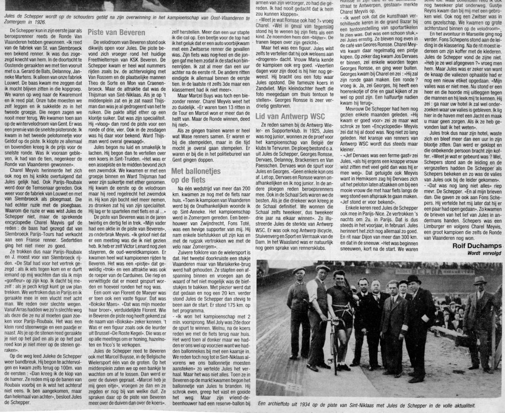 Alhoewel Jules Deschepper in Temse is gestorven, is hij toch geen familie van mij, want in tegenstelling tot de schrijfwijze op het hierbij afgedrukte prentje, schrijft Deschepper in zijn geval wel degelijk in één woord. Bovendien is hij geboren in Zwijndrecht. Ik heb hem ook nooit ontmoet, al was ik in mijn jeugd trouw aanwezig op de jaarlijkse beroepsrennerswedstrijd in Temse die werd georganiseerd door de Descheppervrienden. Jules eindigde overigens zelf tweede in deze wedstrijd in 1931 (*). Dat jaar behaalde hij ook twee van zijn drie overwinningen als beroepsrenner (de Omloop van België en nog een wedstrijd in Mere). Een jaar later zou hij nog winnen in Hekelgem, maar dat was het dan. Hij is dan ook eerder bekend van zijn ereplaatsen, zoals een derde plaats in Luik-Bastenaken-Luik (ook in 1931, duidelijk zijn beste jaar) of in de Schaal Sels (1927). Hij eindigde ook nog twee keer op de dichtste ereplaats in de Drie Zustersteden (in 1928 en 1929). Jules Deschepper was beroepsrenner van 1927 tot 1936. Hij vestigde zich pas in 1933 in Temse.
