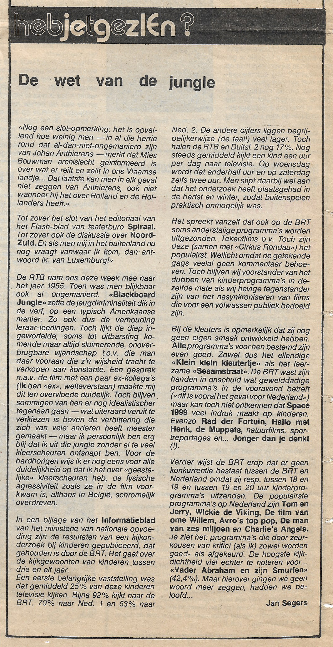 De RTB nam de kijkers 45 jaar geleden mee naar het jaar 1955. De film “Blackboard jungle” zette de jeugdcriminaliteit dik in de verf en met “Rock around the clock” op de aftiteling zorgde dit meteen voor de doorbraak van rock’n’roll… Dit delen: Share op Facebook (Opent in een nieuw venster) Facebook Delen op X (Opent in een nieuw venster) X E-mail een link naar een vriend (Opent in een nieuw venster) E-mail Afdrukken (Opent in een nieuw venster) Print Meer Delen op LinkedIn (Opent in een nieuw venster) LinkedIn Delen op Pinterest (Opent in een nieuw venster) Pinterest Vind-ik-leuk Aan het laden...