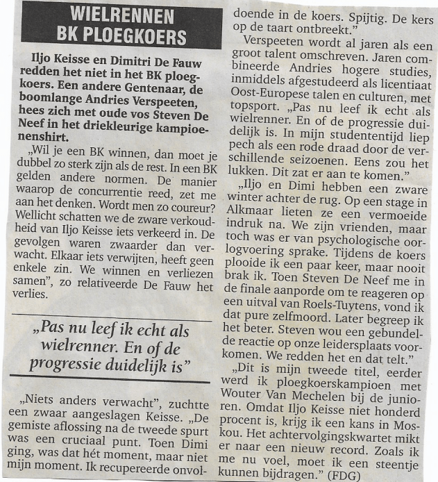 Twintig jaar geleden wist Freddy De Geest ons in De Gentenaar te melden dat de “boomlange” maar “pientere” Andries Verspeeten samen met “oude vos” Steven De Neef de favorieten Iljo Keisse en Dimitri De Fauw wist te verschalken in het nationale kampioenschap ploegkoers!