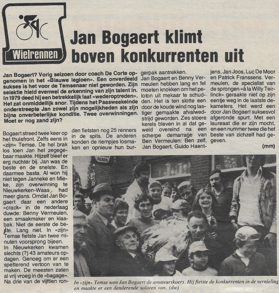 In “zijn” Temse won Jan Bogaert de amateurkoers. Hij fietste de concurrenten in de vernieling en maakte er een denderende soloren van (foto dw). Uit De Voorpost (met dank aan Ruddy Sommereyns) Dit delen: Share op Facebook (Opent in een nieuw venster) Facebook Delen op X (Opent in een nieuw venster) X E-mail een link naar een vriend (Opent in een nieuw venster) E-mail Afdrukken (Opent in een nieuw venster) Print Meer Delen op LinkedIn (Opent in een nieuw venster) LinkedIn Delen op Pinterest (Opent in een nieuw venster) Pinterest Vind-ik-leuk Aan het laden...