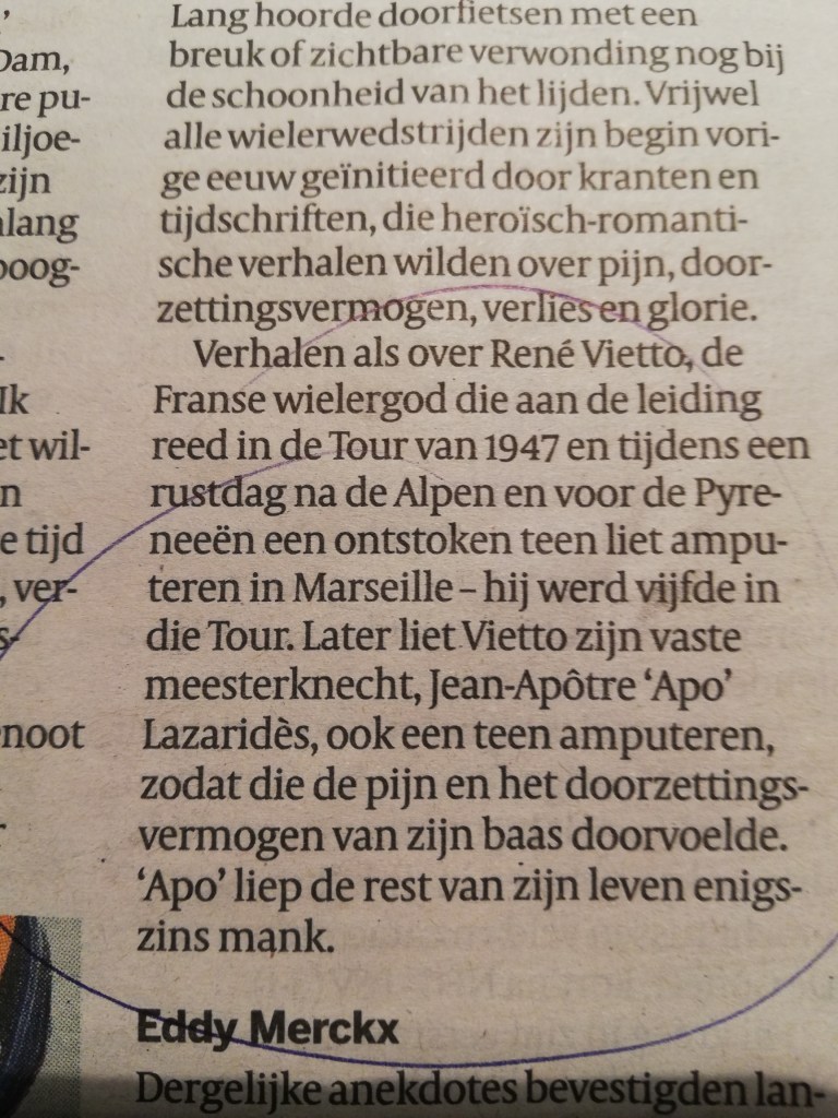 Een teen laten amputeren in de Tour, tijdens de rustdag. Volgens een nog gruwelijker versie deed hij het zelf met een scalpel. En dan nog de geste van Apo Lazarides uit solidariteit, en met ontzag voor zijn leermeester. AMAI, STRAFFEN TOEBACK, ROBERT.