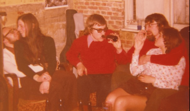 Van links: Marc De decker (alias Johan de Belie; mijn getuige) en toen nog zijn lief Greet Van Goethem (later ook zijn vrouw en dan was ik getuige), ikzelf, Staf De Wilde en Magda Kenis.Er waren natuurlijk ook vrienden uit de Germaanse, zoals Magda Kenis, Staf de Wilde, Frank Coppieters en Kris Haghebaert…En Catherine Heremans met Jo.Er waren wafels en belegde broodjes (op de foto: Luk Boel)Er werd gedanst en gemusiceerd. Ik zou, begeleid door Frank Vanderherten, zelfs “Child in time” hebben gezongen. Frank zelf zong o.m. “Everyday I have the blues”.En de avond (eerder nacht) werd afgesloten met een lange jam met de Haghebaert Brothers.