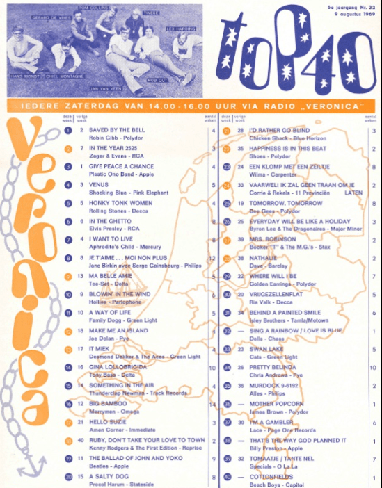 Op 9 augustus 1969 stond “Saved by the bell” van Robin Gibb op nummer één van Veronica’s top veertig.