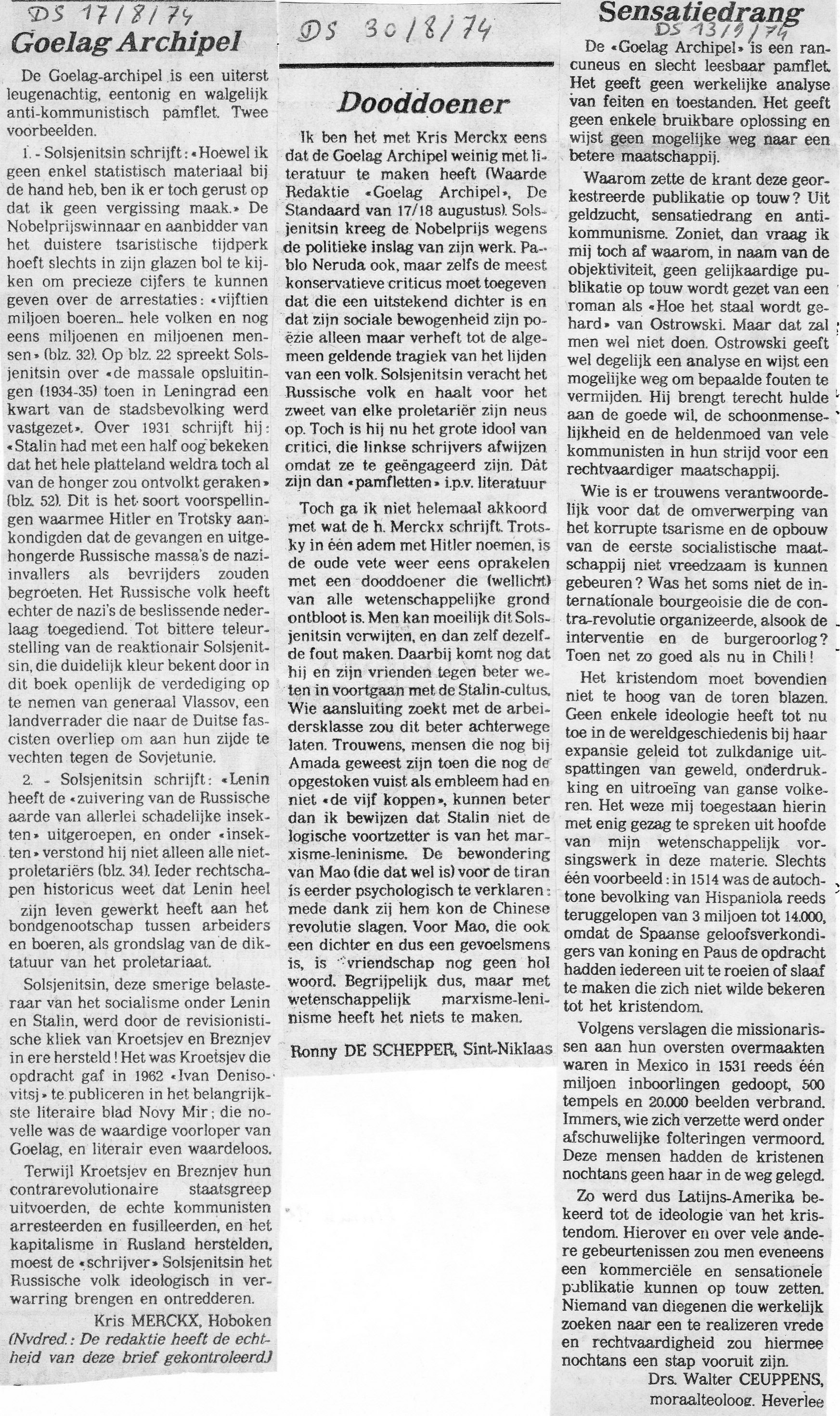In De Standaard van 17 augustus 1974 schreef Kris Merckx (de redactie achtte het noodzakelijk om onder zijn naam te vermelden: “de redactie heeft de echtheid van deze brief gecontroleerd”) een brief n.a.v. het verschijnen van zijn boek “De Goelag Archipel” (en niet “De Goelash Archipel” zoals een grappenmaker ervan heeft gemaakt) van de Russische dissidente schrijver Aleksandr Solzjenitsyn (1918-2008). De openingszin van de brief van Kris Merckx gaf meteen reeds aan waarover het precies ging: “De ‘Goelag Archipel’ is een uiterst leugenachtig, eentonig en walgelijk anti-communistisch pamflet.” Ik schreef hierop een reactie, die op 30 augustus 1974 eveneens in de brievenrubriek van De Standaard werd gepubliceerd…