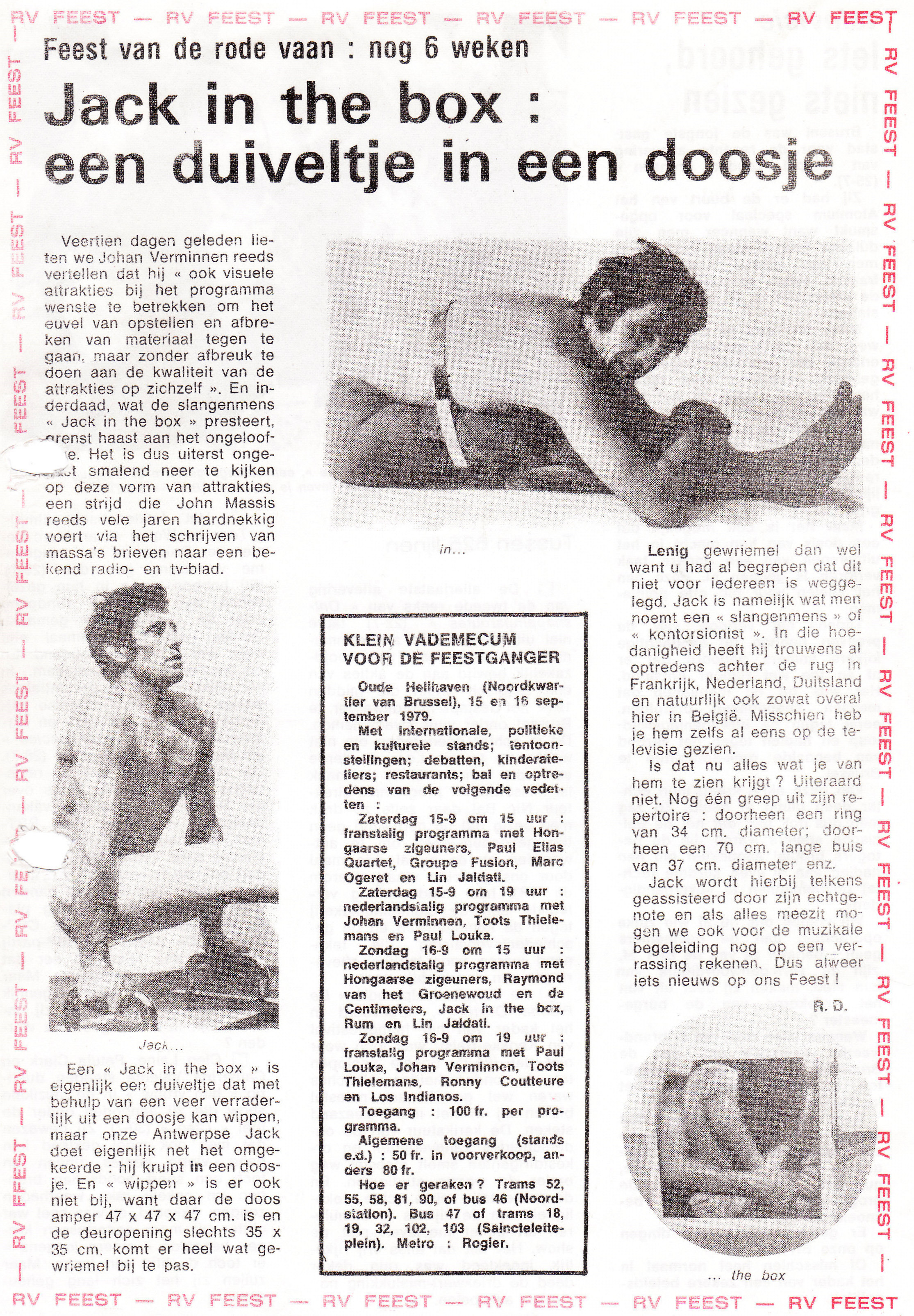 Veertien dagen geleden lieten we Johan Verminnen reeds vertellen dat hij « ook visuele attracties bij het programma wenste te betrekken om het euvel van opstellen en afbreken van materiaal tegen te gaan, maar zonder afbreuk te doen aan de kwaliteit van de attracties op zichzelf ». En inderdaad, wat de slangenmens Jack in the box presteert, grenst haast aan het ongelooflijke. Het is dus uiterst ongepast smalend neer te kijken op deze vorm van attracties, een strijd die John Massis reeds vele jaren hardnekkig voert via het schrijven van massa’s brieven naar een bekend radio- en tv-blad.
