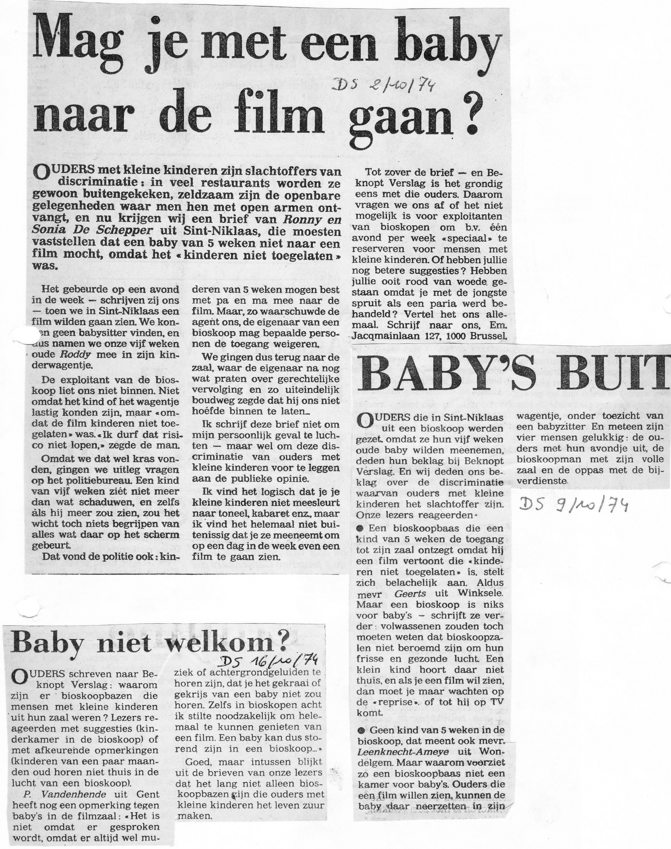 Ik herinner me dat een paar jaar geleden een jong stel uit Sint-Niklaas dergelijk probleem aanhangig maakte via Beknopt Verslag in de dagbladen van de Standaardgroep. Spijtig genoeg was hun kind echter nog een baby zodat de discussie enigszins de mist inging. De oorzaak van alle herrie was immers dat hun de toegang tot een bioscoop met hun kind erbij ontzegd werd. Bijgevolg spitsten de reacties zich toe, enerzijds op het feit dat het toch stil moet zijn in een bioscoop en dat bijgevolg baby’s best geweerd worden en anderzijds op brieven van sympathiserende ouders die uit restaurants, hotels e.d. waren gezet omdat ze het ongeluk hadden een klein kind te hebben, iets waarover nu iedereen dankzij dit gezegende jaar van het kind zo lekker kneuterig ligt te doen.