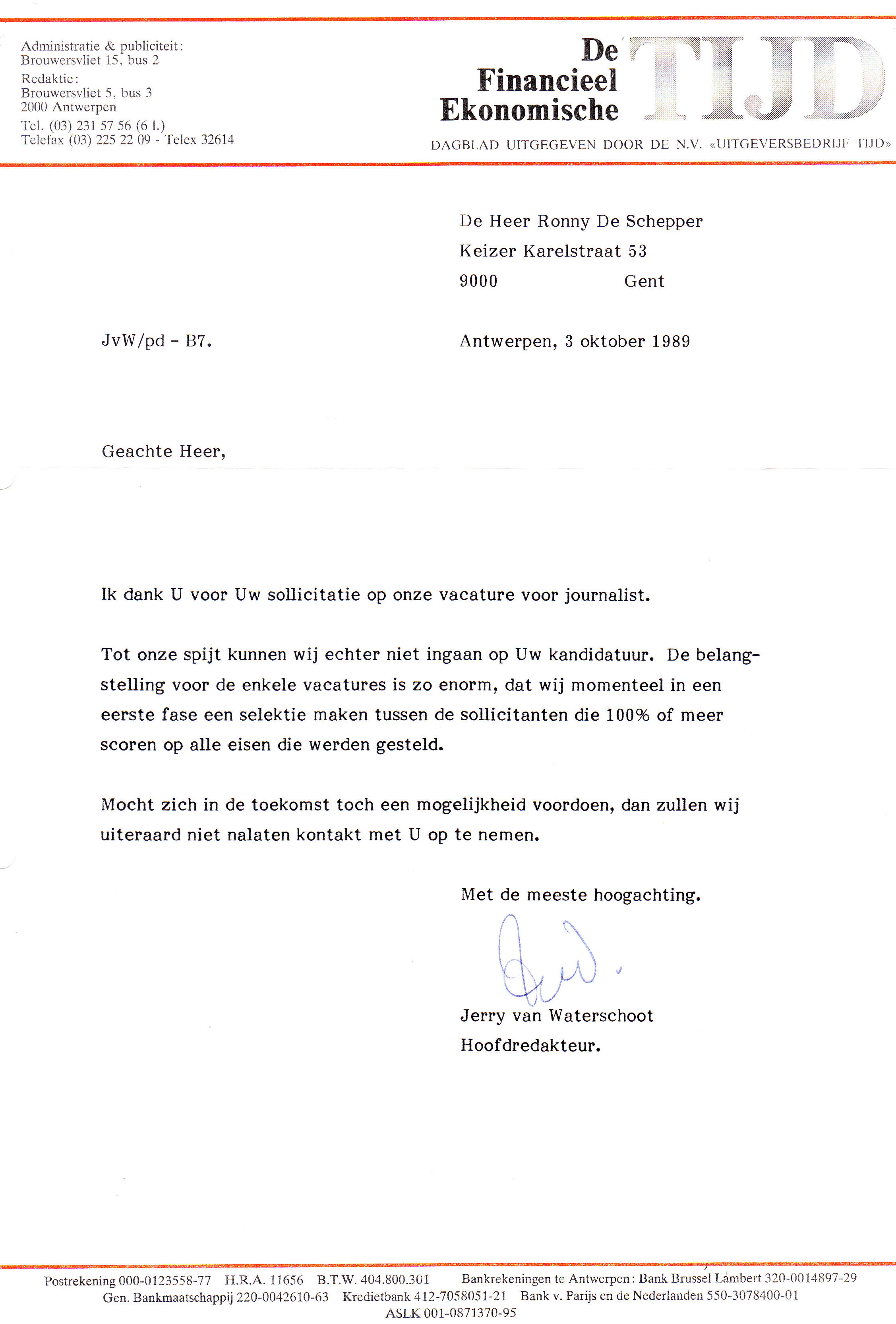 Niet dus, maar ja, om dan toch nog eens naar een andere afwijzingsbrief te verwijzen, namelijk die van Jerry van Waterschoot, hoofdredacteur van de Financieel Economische Tijd: als men de luxe heeft om een selectie te maken tussen “sollicitanten die 100% of meer scoren op alle eisen die werden gesteld”, ja dan…