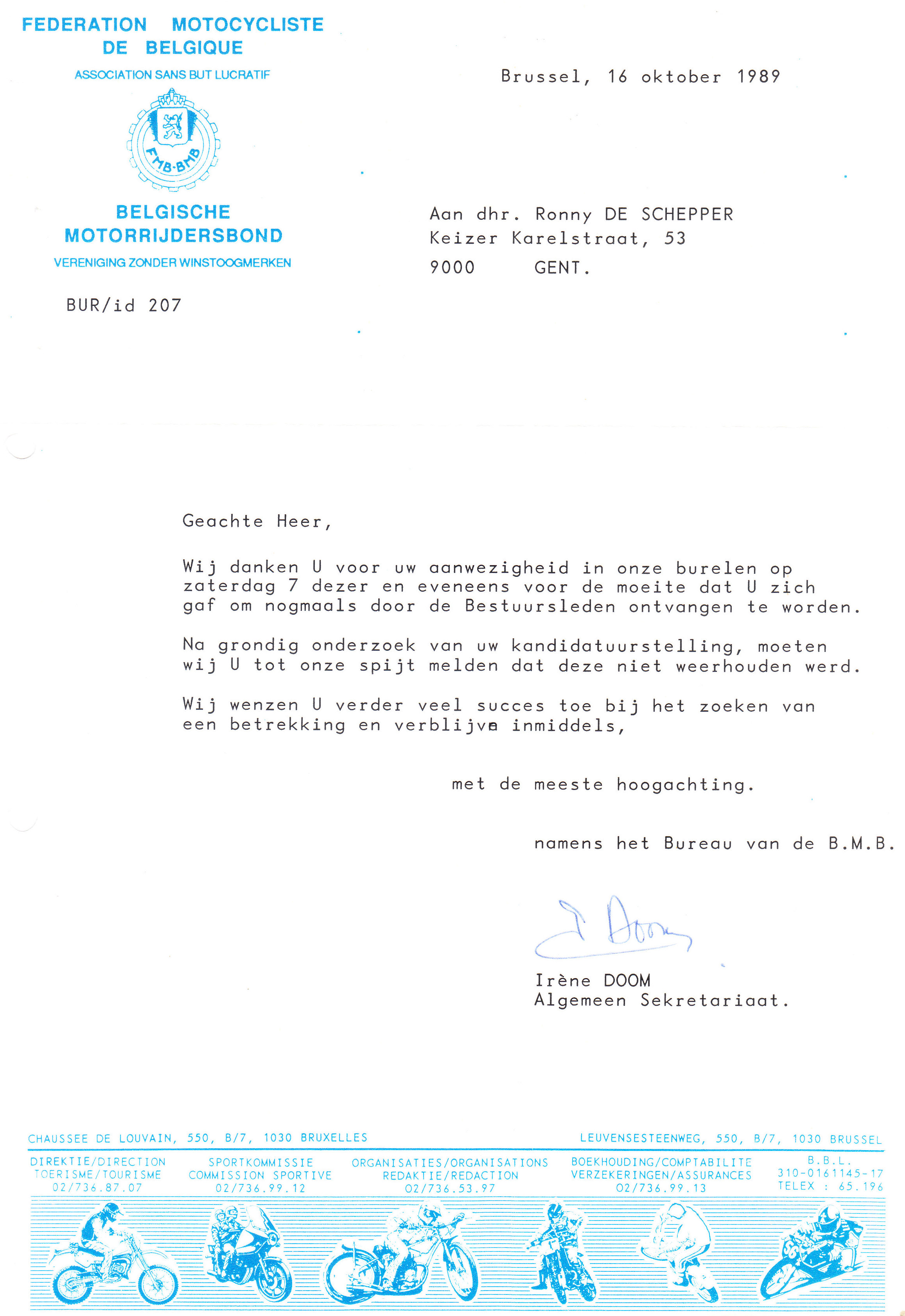 Op 7 oktober 1989 was ik naar een soort van examen geweest op de Belgische Motorrijdersbond in de Leuvensesteenweg van Brussel. Wat had ik – als iemand die zelfs niet eens met de wagen kon rijden – te zoeken op een bond die zich bezig houdt met gemotoriseerde sporten? Niet veel, ik geef het onmiddellijk toe. Die ligging op de Leuvensesteenweg zou me echter in staat stellen tijdens de middagpauze of na afloop van mijn uren af te zakken naar de BRT en een geregelde aanwezigheid daar gaf m.i. meer kans op een betrekking die beter bij me zou passen dan een functie op de BMB.