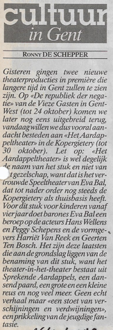 Peggy Schepens (hier met Bob De Moor op YouTube) speelde de hoofdrol in “Het Aardappeltheater”… Dit delen: Klik om te delen op Facebook (Opent in een nieuw venster) Facebook Klik om te delen op X (Opent in een nieuw venster) X Klik om dit te e-mailen naar een vriend (Opent in een nieuw venster) E-mail Klik om af te drukken (Opent in een nieuw venster) Print Meer Klik om op LinkedIn te delen (Opent in een nieuw venster) LinkedIn Klik om op Pinterest te delen (Opent in een nieuw venster) Pinterest Vind-ik-leuk Aan het laden...