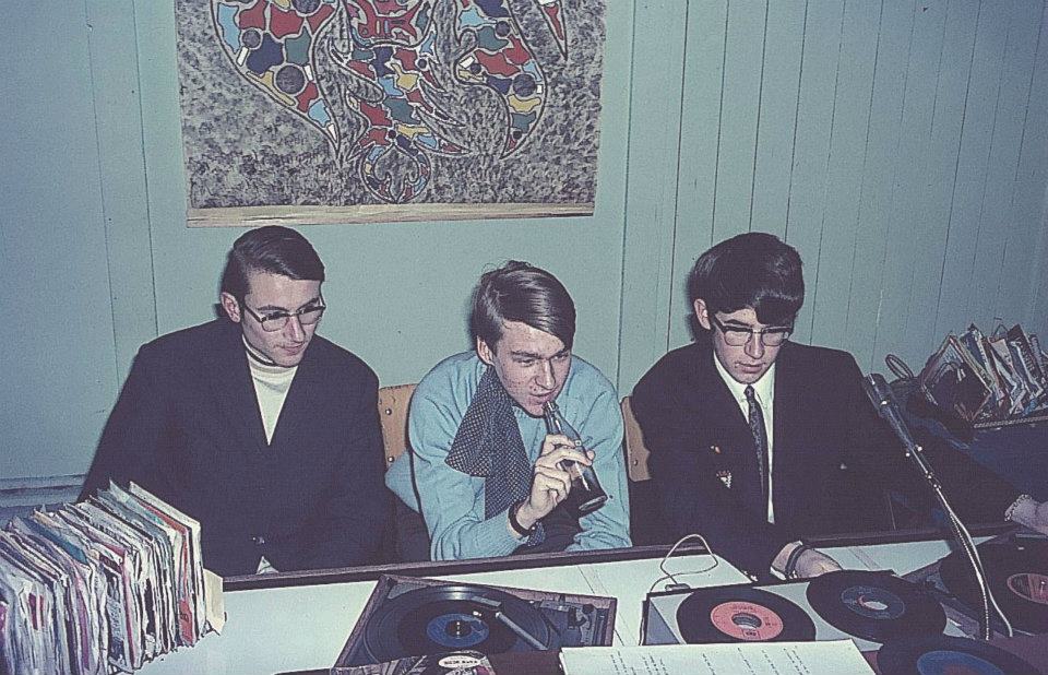 (***) Dat is bij mijn weten niet gebeurd, al stond toenmalig hoofdredacteur van De Rode Vaan, Piet Lampaert, zeker niet afkerig tegenover d.j.’s. Integendeel, het is precies via het feit dat hij nog d.j. heeft gespeeld op een door mij georganiseerde fuif in mijn studententijd dat wij elkaar hebben leren kennen. Vóór die tijd (dus in mijn middelbare schooltijd) was Johan de Belie actief als d.j.Adhemar. Onvergetelijk is b.v. zijn “vondst” om tijdens de “kuskesdans” (la bamba) de uitgekozen persoon een tong te draaien als hij “kus” zei! Johan beoefende dit vak vooral omwille van zijn taalvaardigheid, technisch was hij minder begaafd. Eén keer heeft hij zelfs met een gebroken arm d.j. gespeeld (wegens een ongeluk op de dag zelf, van doorzettingsvermogen gesproken!), dus dat was eigenlijk zelfs onmogelijk. Voor de technische kant van de zaak stond dan meestal klasgenoot Roland Hiel in, die dit later nog een tijdje is blijven doen als D.J.Rolle. Zelf heb ik ook één keer d.j. gespeeld en ook ik had hiervoor “technische assistentie” nodig en die werd dan verleend door Luc Carnier. Dat moet dan enkele jaren na dit artikel gebeurd zijn, halfweg de jaren tachtig, zeg maar. Onderstaande foto dateert dan weer van vele jaren eerder, maar ik denk niet dat ik hier echt als d.j. aan het werk ben. Misschien kwam ik gewoon “een plaatje aanvragen”, iets wat ik wel vaker deed.